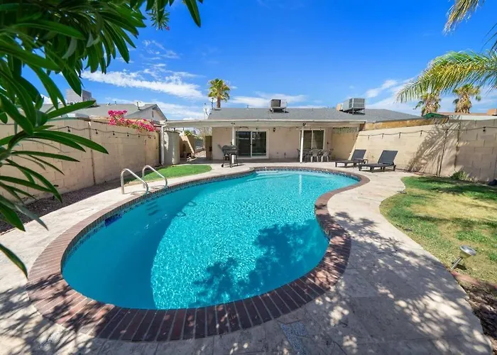 Situada en el distrito Oeste de Las Vegas Strip, la casa de vacaciones se encuentra a poco más de 15 minutos en coche de un lugar sagrado como la Capilla Nupcial Little White. Los huéspedes encontrarán el Mandalay Bay Resort and Casino a una distancia de 3 km de esta villa, y la High Roller está a 2,1 km.